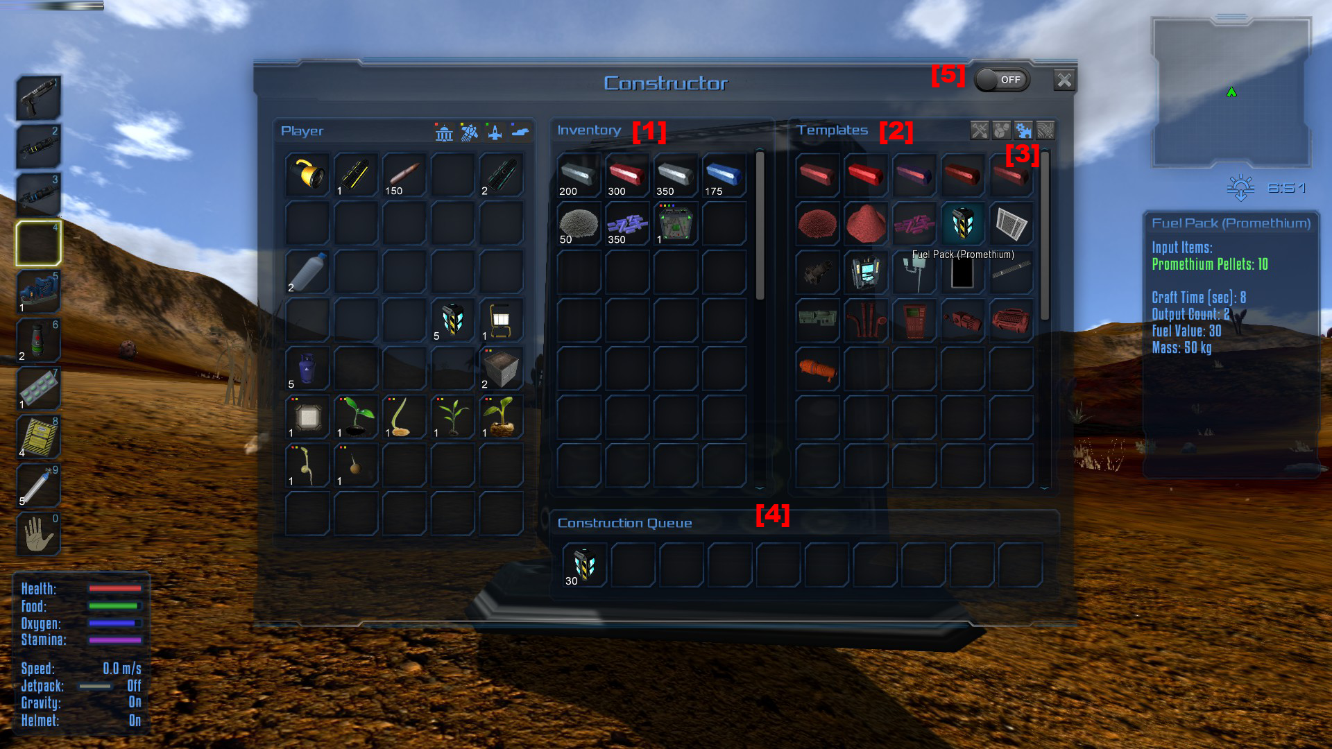 If you were following the steps described in the "Energy" chapter above, you should now have around 70 Fuel Packs waiting to be picked up from the constructor inventory [1]. Drag and Drop the stack to your player inventory (or hold SHIFT and click once)