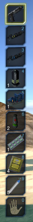 A consumable item (MediKit, Food, Small O2 Bottle, Antidotes...) can be added to the toolbar first (See HUD Info below) and then consumed.