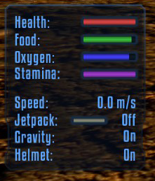 Personal Info Screen: Shows data about your Health (red), Hunger (green), Oxygen level (blue), Stamina (purple) and a few others, like Jetpack load status (orange bar; drops when Jetpack is used; refills automatically)